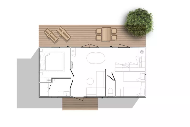 Cet hébergement vous plaira part ses grands volumes et son aménagement. Profitant d'une grande pièce de vie mais également d'une grande terrasse vous ferez votre entrée d'un côté du mobil-home et pourrez profiter de la terrasse de l'autre côté avec la vue sur le lac.