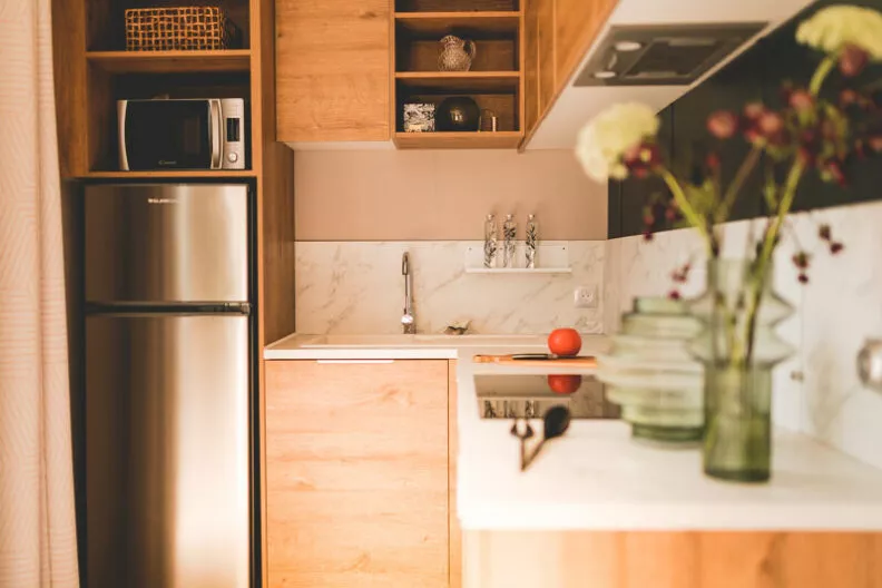Réfrigérateur, plaque vitrocéramique, évier, vaisselle, cafetière électrique, machine à expresso (Nespresso), bouilloire, grill pain