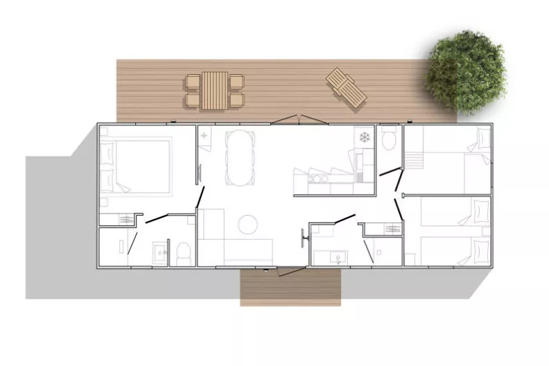 Cet hébergement vous plaira part ses grands volumes et son aménagement. Profitant d'une grande pièce de vie mais également d'une grande terrasse vous ferez votre entrée d'un côté du mobil-home et pourrez profiter de la terrasse de l'autre côté avec la vue sur le lac.