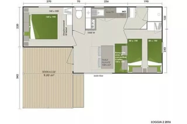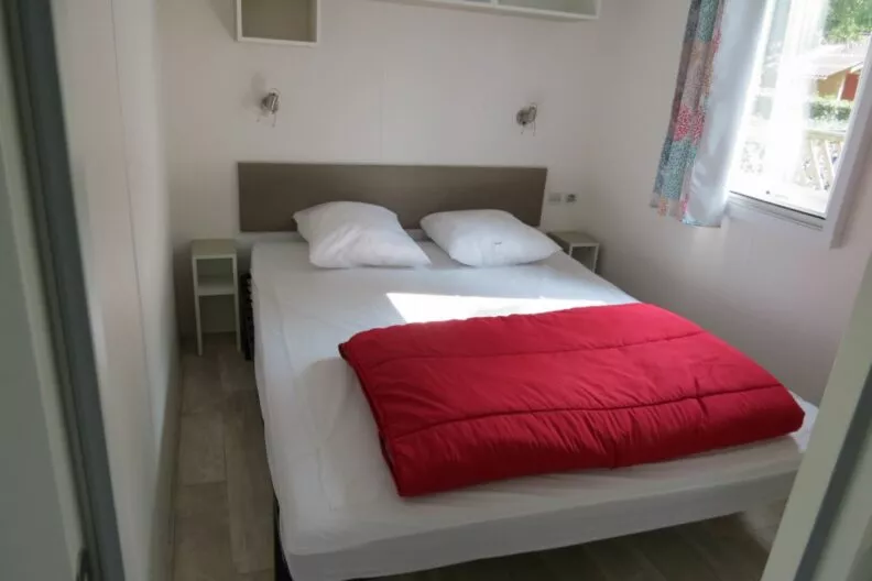 Le Loggia bénéficie d'une large baie vitrée dans la pièce de vie pour une luminosité exceptionnelle et une joli vue sur le lac ou les emplacements de verdure du Camping de la Récré. La terrasse semi-couverte apporte également un confort en extérieur.